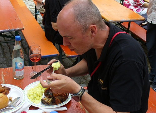 Während die Sportler auf dem Mittelalterlichen Marktplatz auf die Siegerehrung warten, können sie sich bei einem guten Sulzfelder Wein und fränkischen Spezialitäten von den Strapazen erholen.