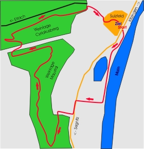 Es beginnt mit einem flachen Kilometer auf dem Radweg durch die Main-Auen bevor nach einem dezenten Anstieg der Hohlweg zur Weinhalla wartet. Gute 80 Hm müssen dort auf kurzer Entfernung bewältigt werden! Überholen ist hier aufgrund des schmalen Weges nur schwer möglich! Also vorher "Gas geben", wer vorne sein will!