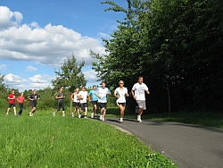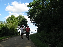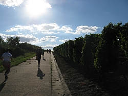 Nach einigem sanften Auf und Ab führt der Lauf nach links in Richtung der Weinlage "Cyriakusberg", wo nach ca. 5 Km auf einer leichten Gefällestrecke und guten Weinbergswegen noch einmal richtig Tempo gemacht werden kann.